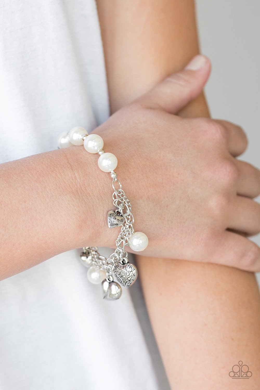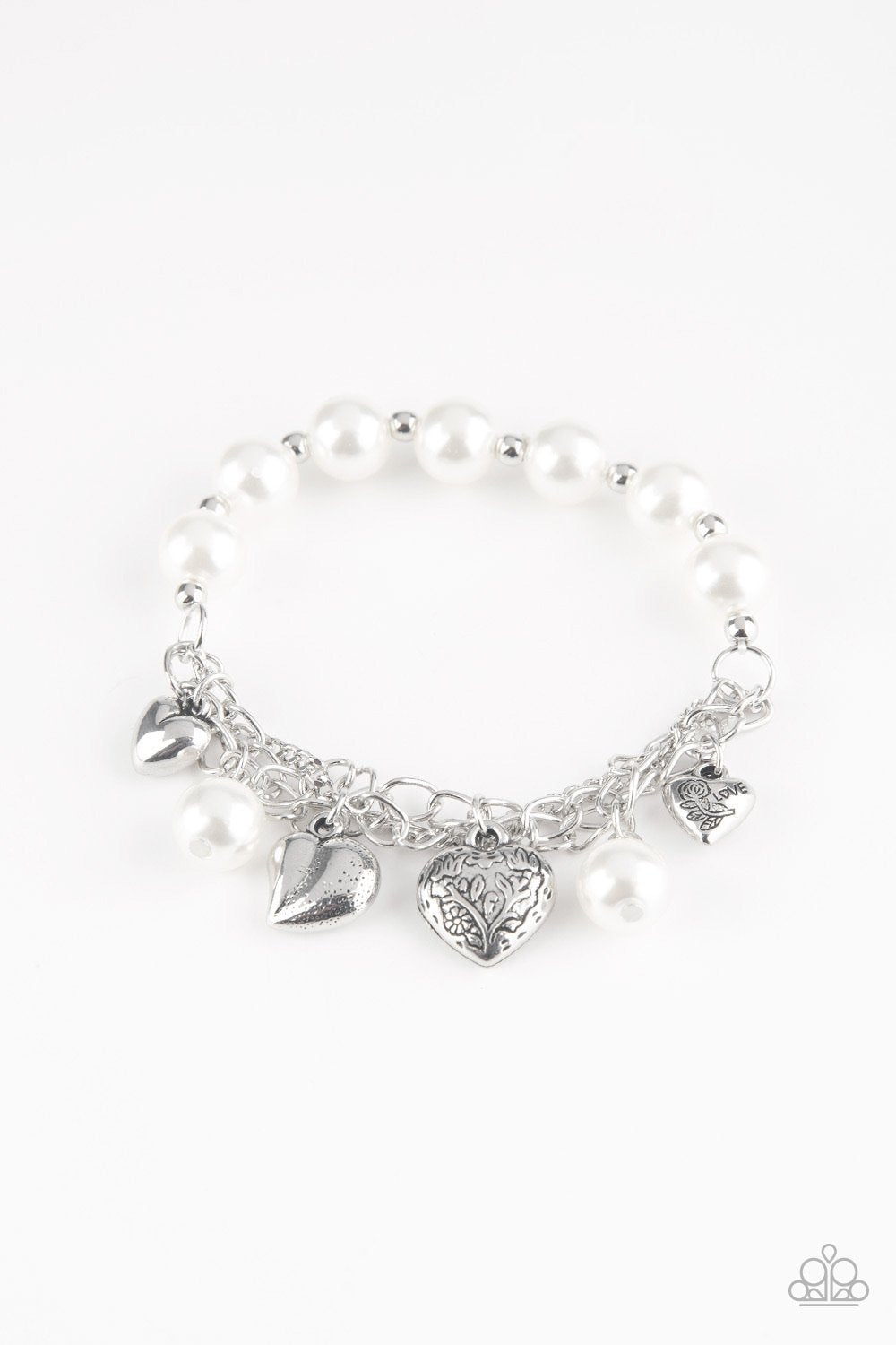 Attached to a section of shimmery silver chain, pearly brown and dainty silver beads are threaded along a stretchy band. Mismatched silver heart charms swing from the glistening chain, creating a flirty fringe.