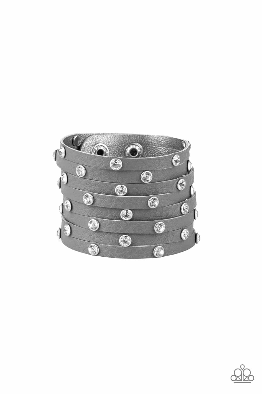 A thick black leather band has been spliced into numerous brown strands. Featuring sleek silver frames, glittery white rhinestones are sprinkled across the leather bands for a sassy finish. Features an adjustable snap closure. Also, available in brown and silver.