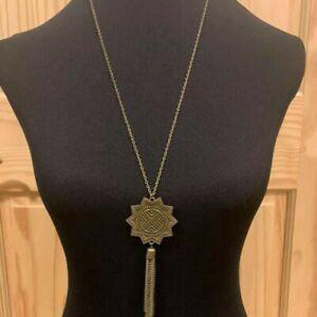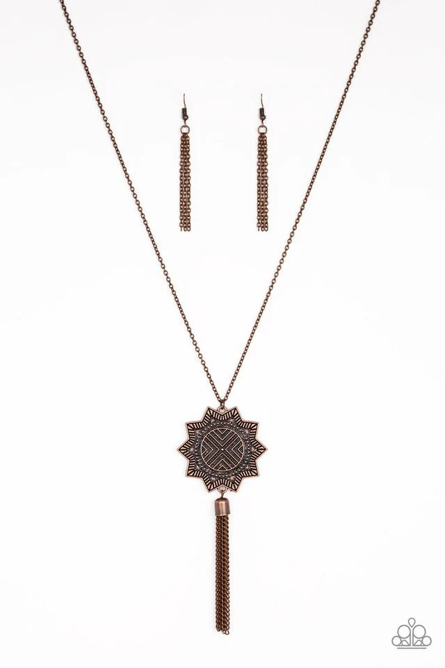 A textured sunburst pendant swings from the bottom of a lengthened brass chain. A shimmery brass chain tassel swings from the bottom of the tribal inspired pendant for a seasonal finish. Features an adjustable clasp closure.