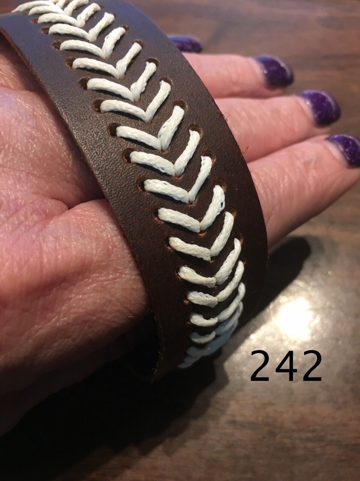 Distressed brown leather cording is stitched across the front of a thick leather band for a rugged look. Features an adjustable snap closure.