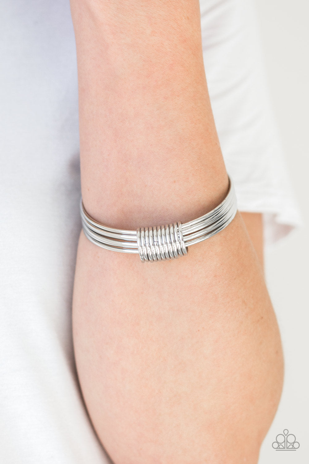 Glistening silver hoops slide along six silver bangles, coalescing the stack into one single bracelet.