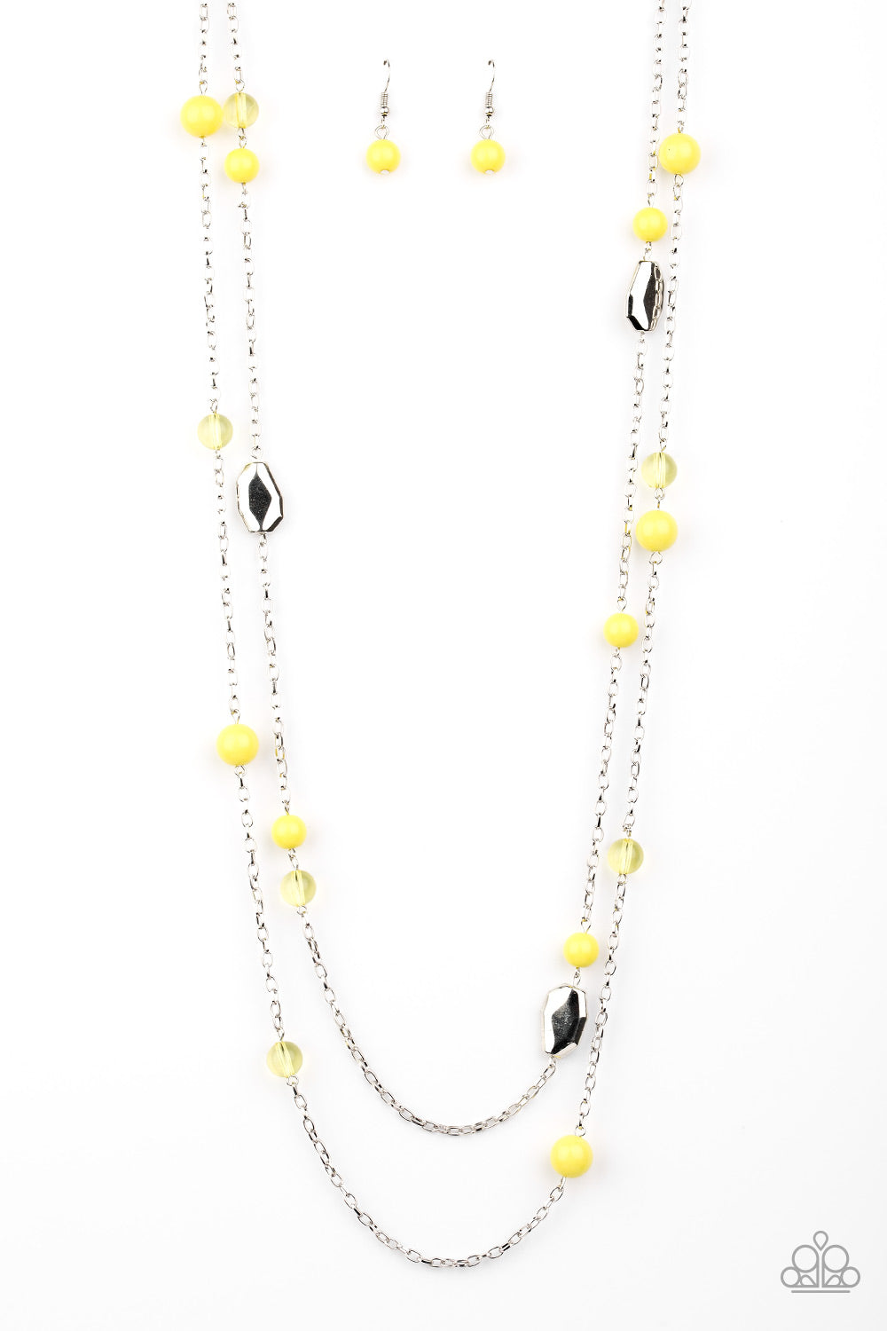 Featuring faceted silver accents, glassy and polished yellow beads trickle along strands of shimmery silver chains for a seasonal look. Features an adjustable clasp closure.