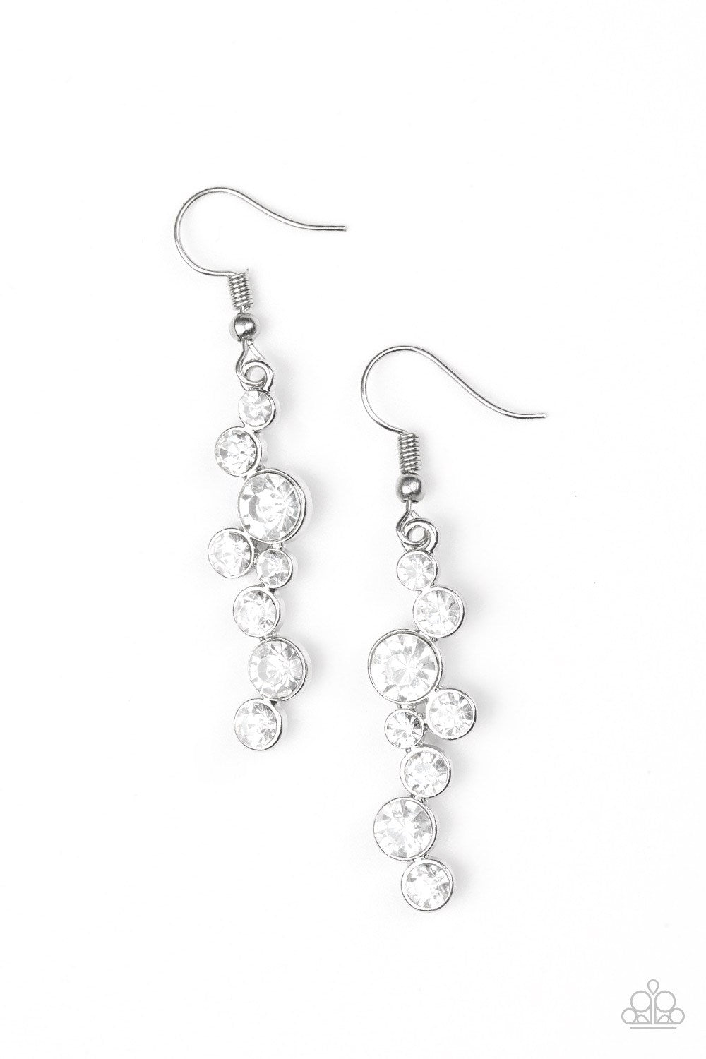 Varying in size, glittery white rhinestones tumble from the ear, coalescing into a magnificent lure. Earring attaches to a standard fishhook fitting. Also, available in white.