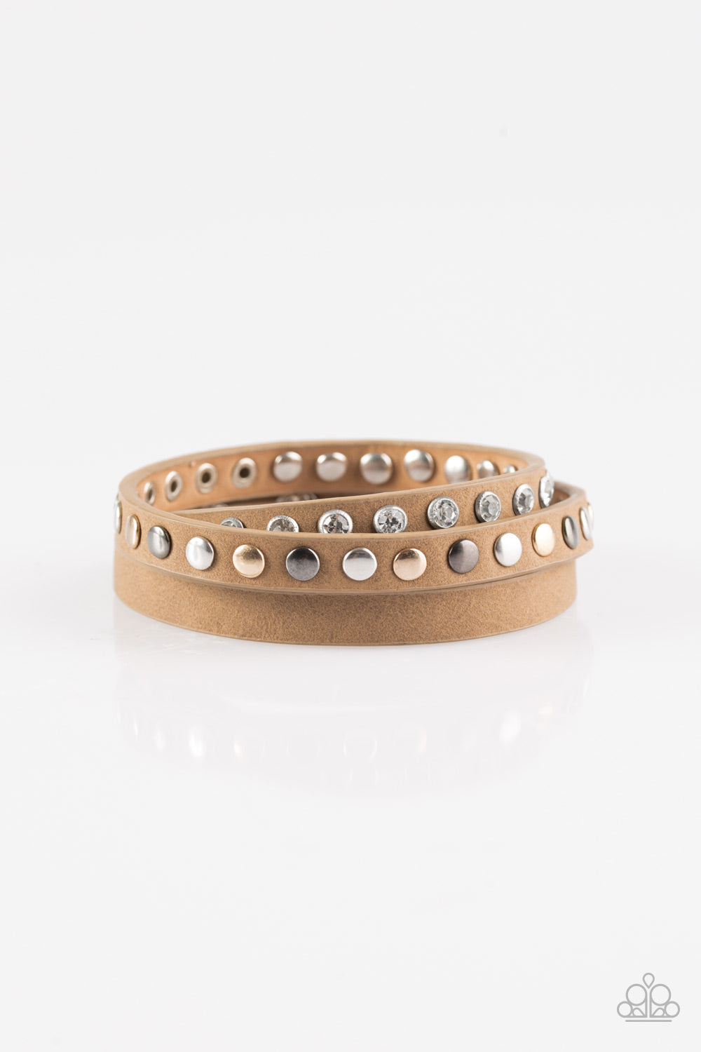 A skinny strip of brown leather is encrusted in sections of glittery white rhinestones and flat gold, gunmetal, and silver studs. The elongated band double wraps around the wrist for a fierce one-of-a-kind look. Features an adjustable snap closure.