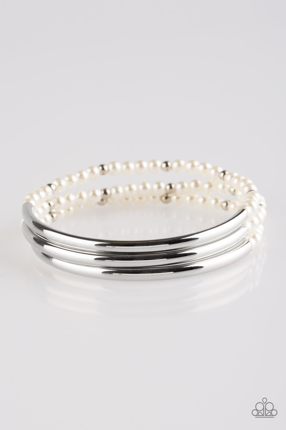 Shiny silver bars and pearly white beads are threaded along stretchy elastic bands, creating refined layers across the wrist.