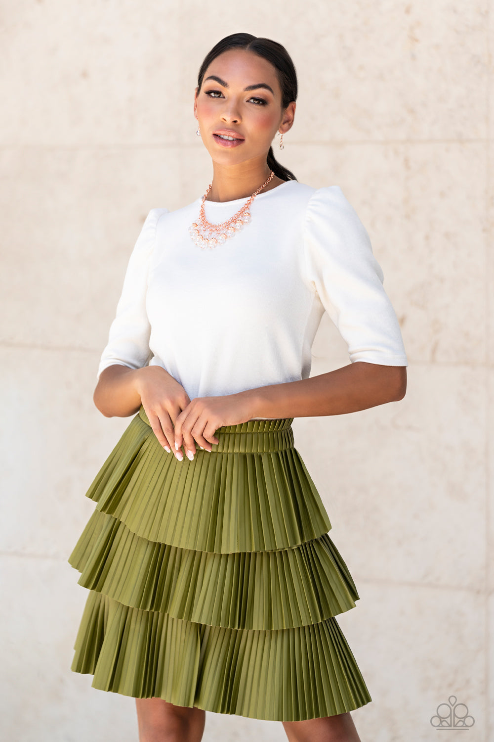 Featuring a stellar iridescence, pairs of glassy beads are separated by shiny copper discs, trickling below the collar in an effervescent fringe. Features an adjustable clasp closure. Due to its prismatic palette, color may vary.