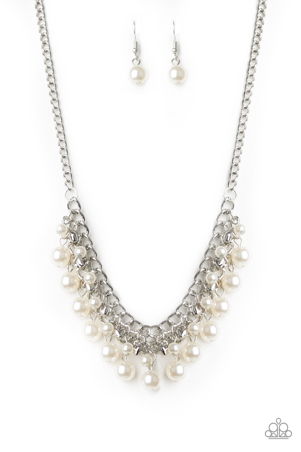 Tiers of dainty silver heart charms, dainty white pearls, and larger white pearls cascade below the collar, creating a flirtatiously layered fringe. Features an adjustable clasp closure.
