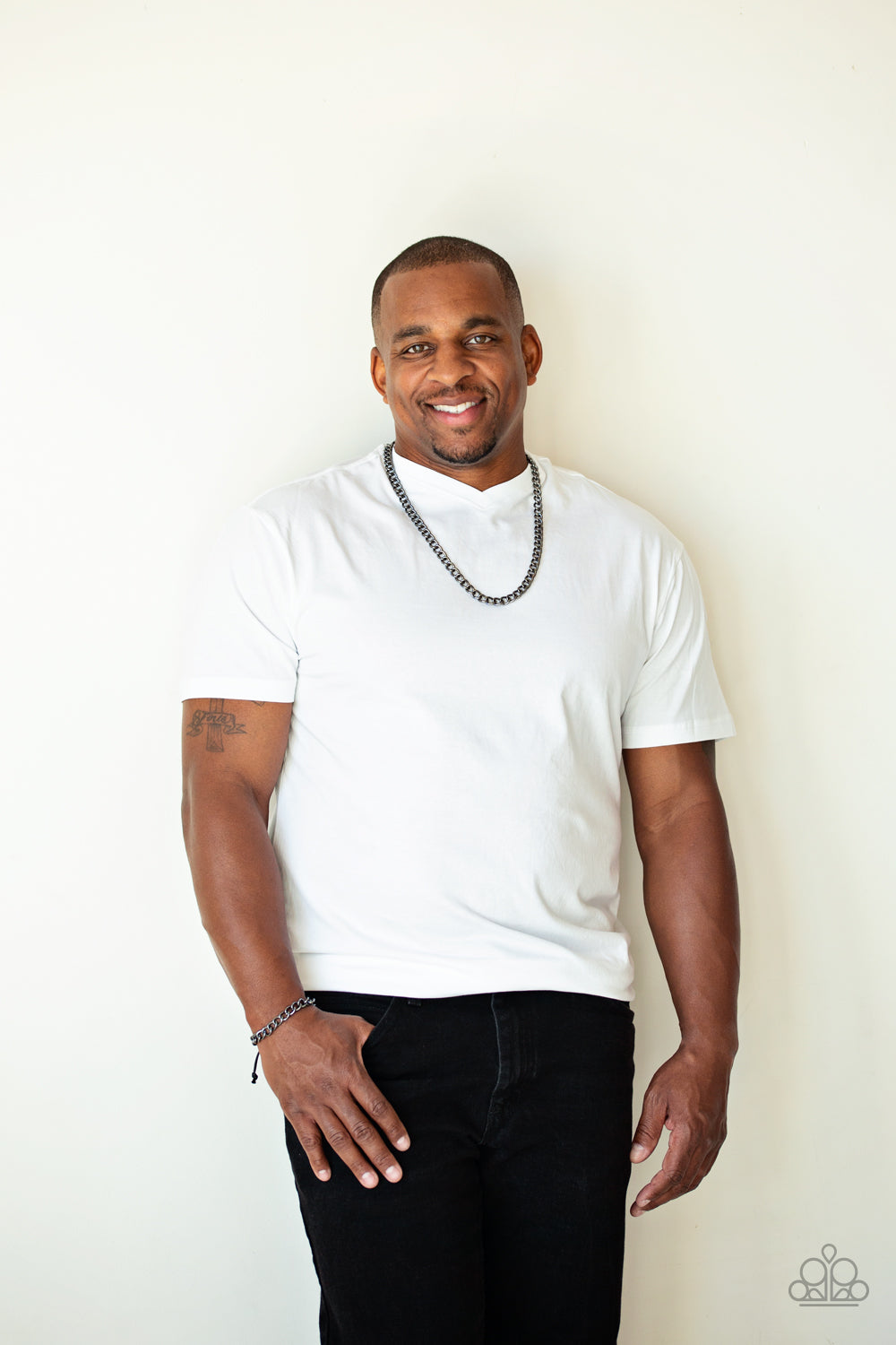 Brushed in a high-sheen finish, a classic gold chain drapes across the chest for a casual look. Features an adjustable clasp closure.
