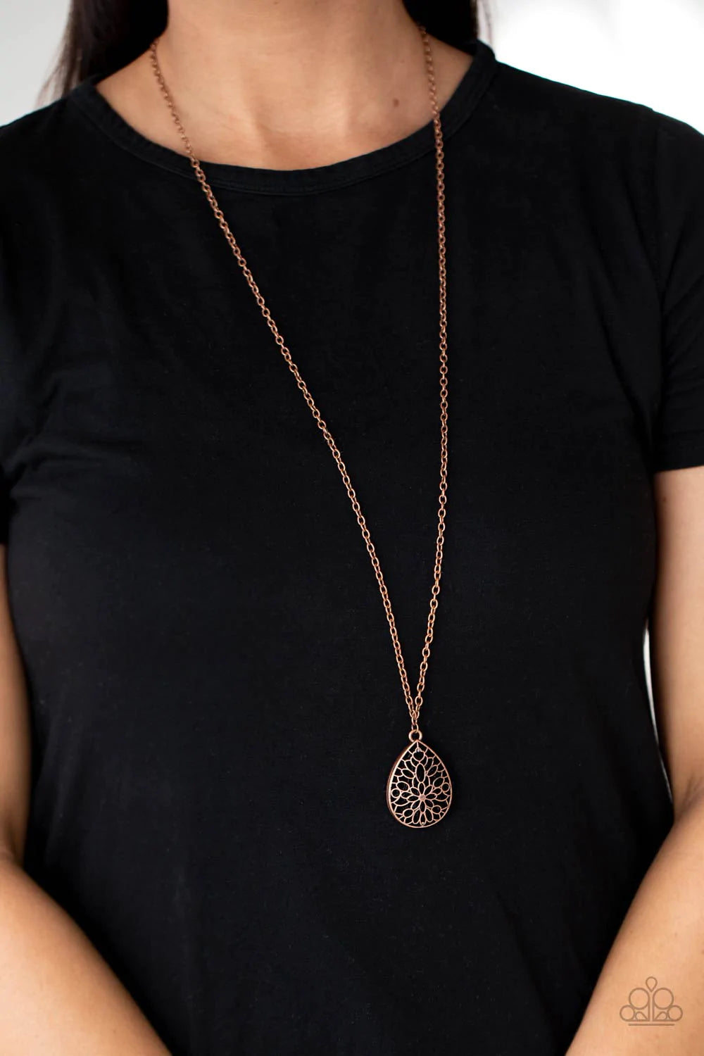Brushed in a rustic shimmer, stenciled copper frames stack into an airy 3-dimensional teardrop pendant at the bottom of a lengthened copper chain. Features an adjustable clasp closure.
