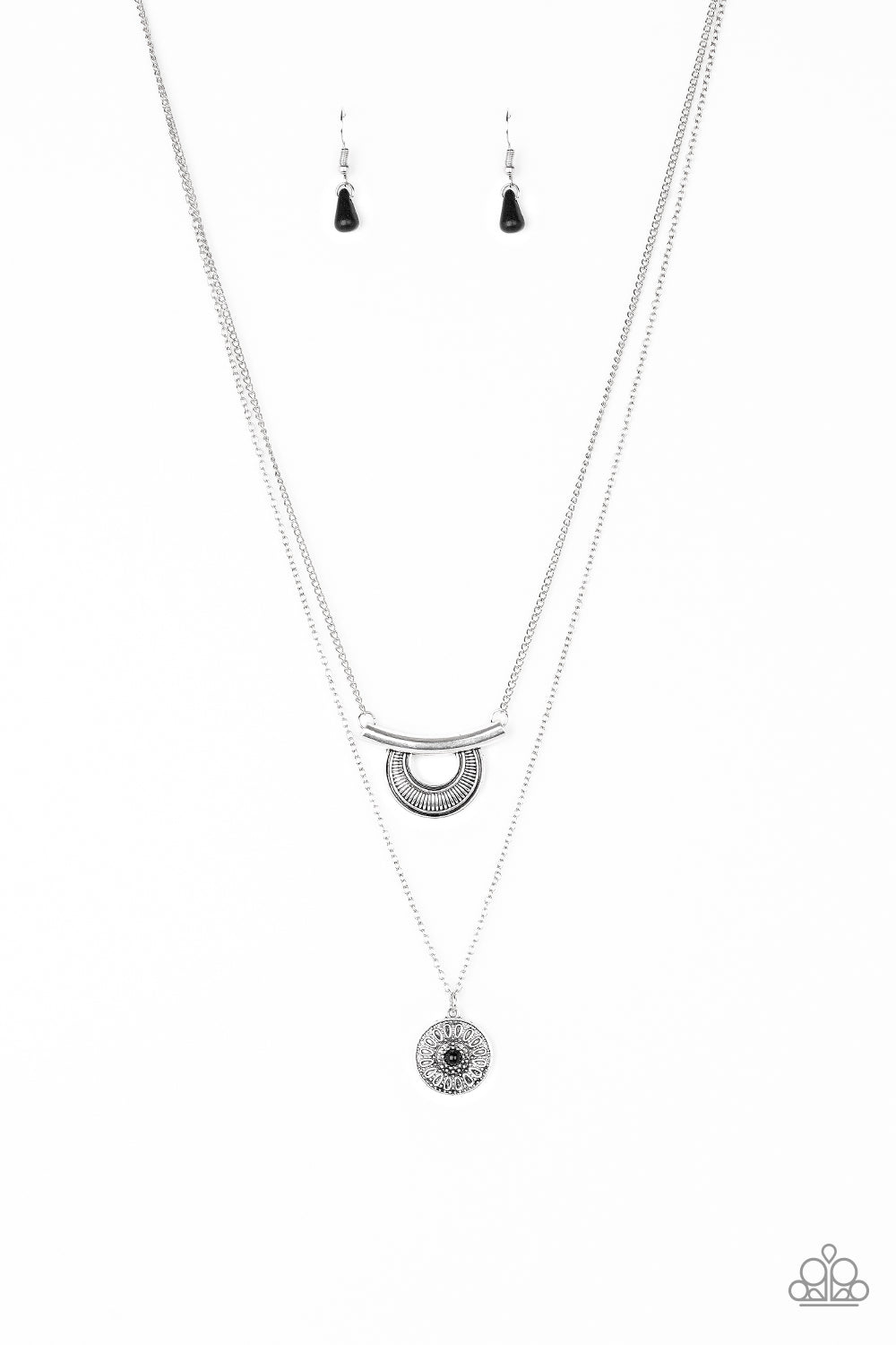 Radiating with linear patterns, a shimmery silver frame swings from the uppermost chain above a silver disc radiating with floral detail. A dainty black bead dots the center of the lowermost pendant for a colorful finish. Features an adjustable clasp closure.