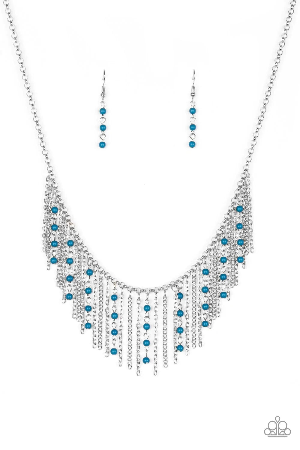Infused with blue beaded tassels, shimmery silver chains stream below the collar, creating a colorful fringe. Features an adjustable clasp closure.