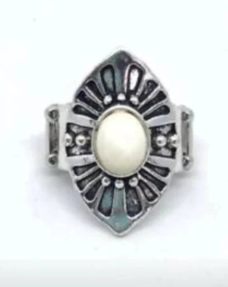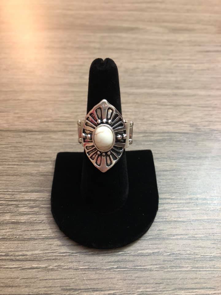 A vivacious pink stone bead is pressed into the center of an angular silver frame radiating with studded and antiqued textures. Features a stretchy band for a flexible fit.