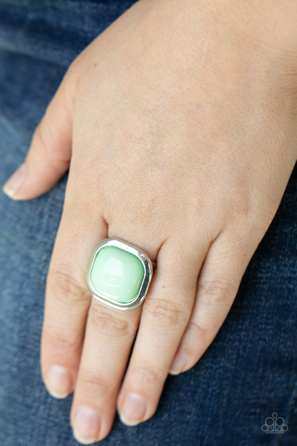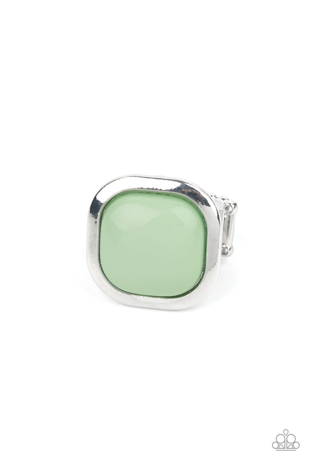 An oversized Green Ash bead is pressed into the center of a square silver frame, creating a powerful pop of color atop the finger. Features a stretchy band for a flexible fit.