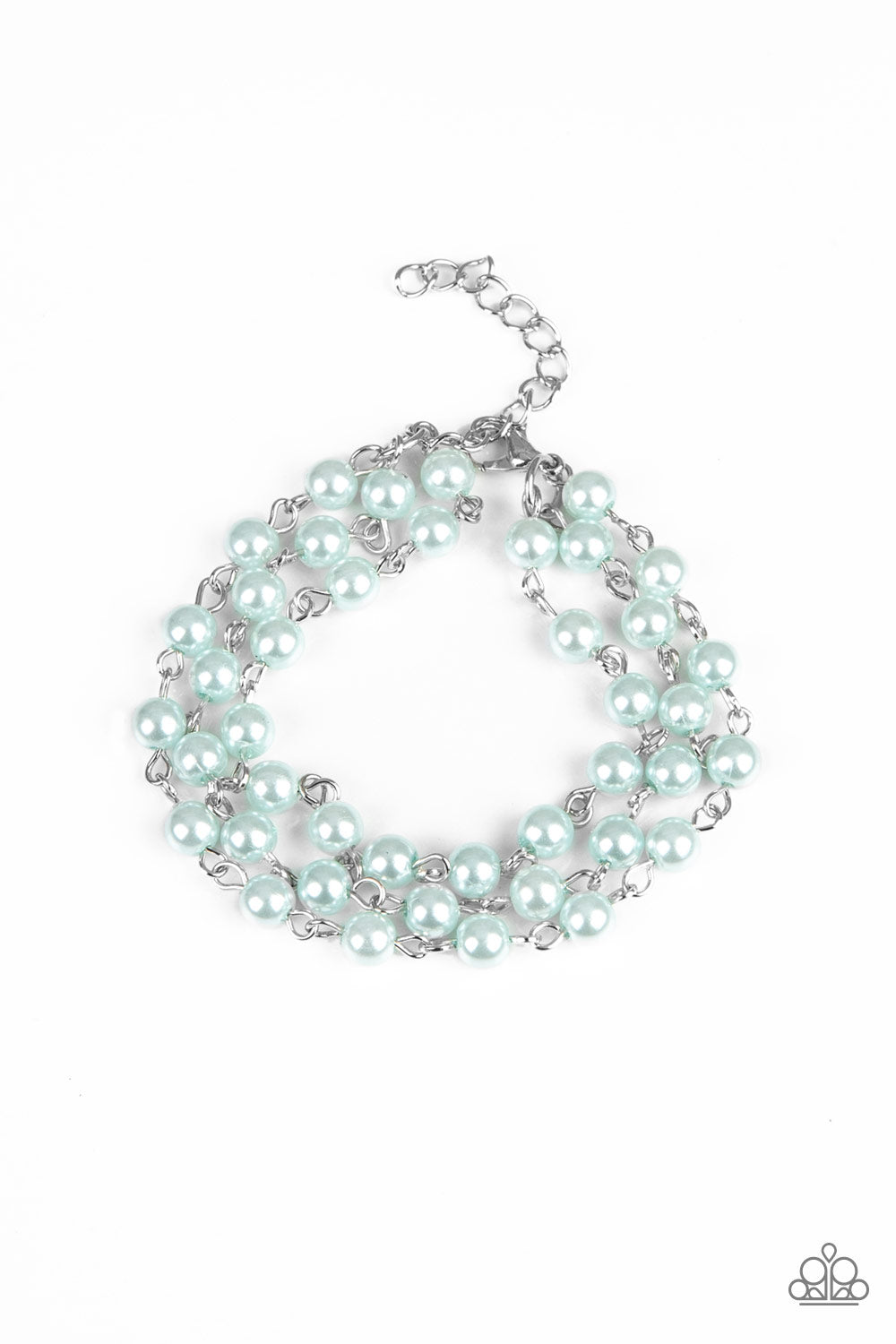 Three strands of blue pearls join around the wrist, creating timeless layers. Features an adjustable clasp closure.