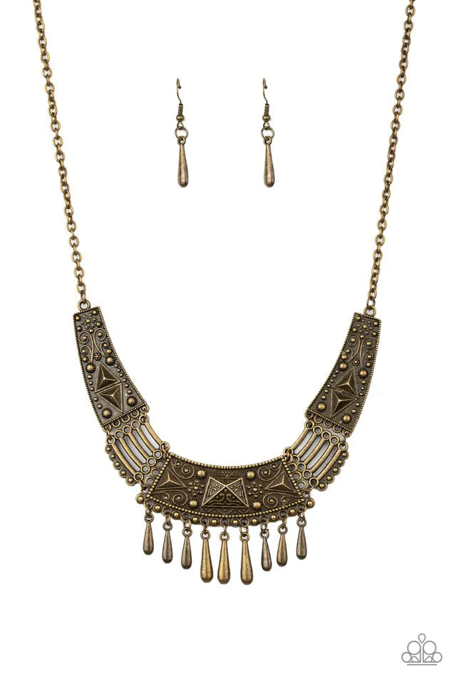 Embossed and studded in tribal inspired details, glistening brass plates connect below the collar in a fierce fashion. Dainty teardrop brass beads drip from the center of the pendant, creating a delicate fringe. Features an adjustable clasp closure.