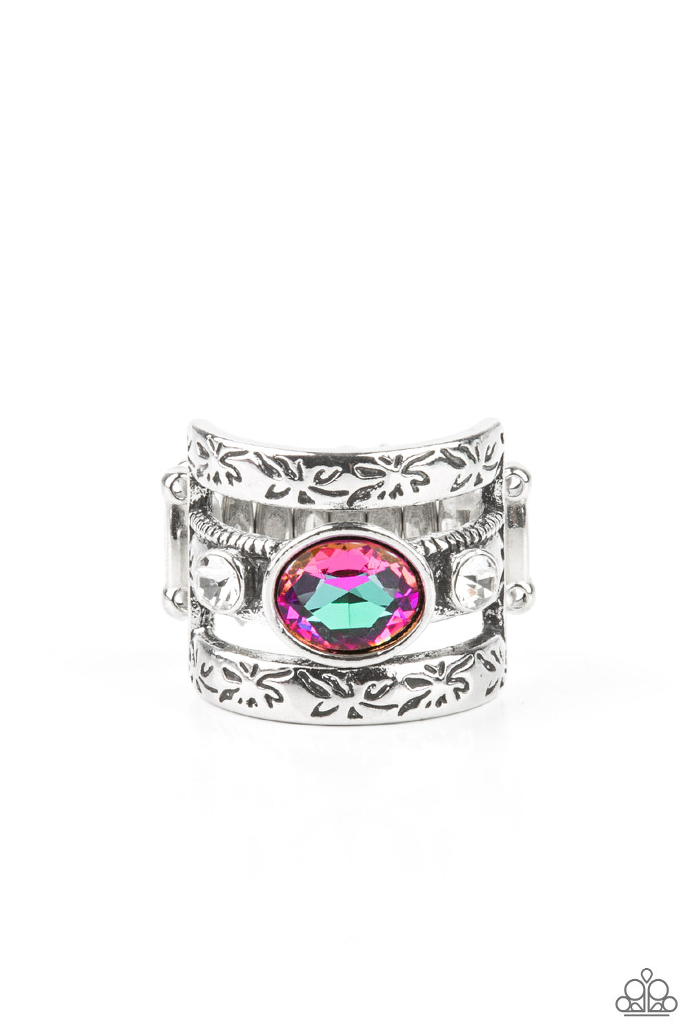 A gleaming iridescent green oval cut gem sits atop a silver metal bar with smaller white rhinestones resting on either side. Silver bars etched in floral detail on top and bottom create a towering effect across the finger. Features a stretchy band for a flexible fit.