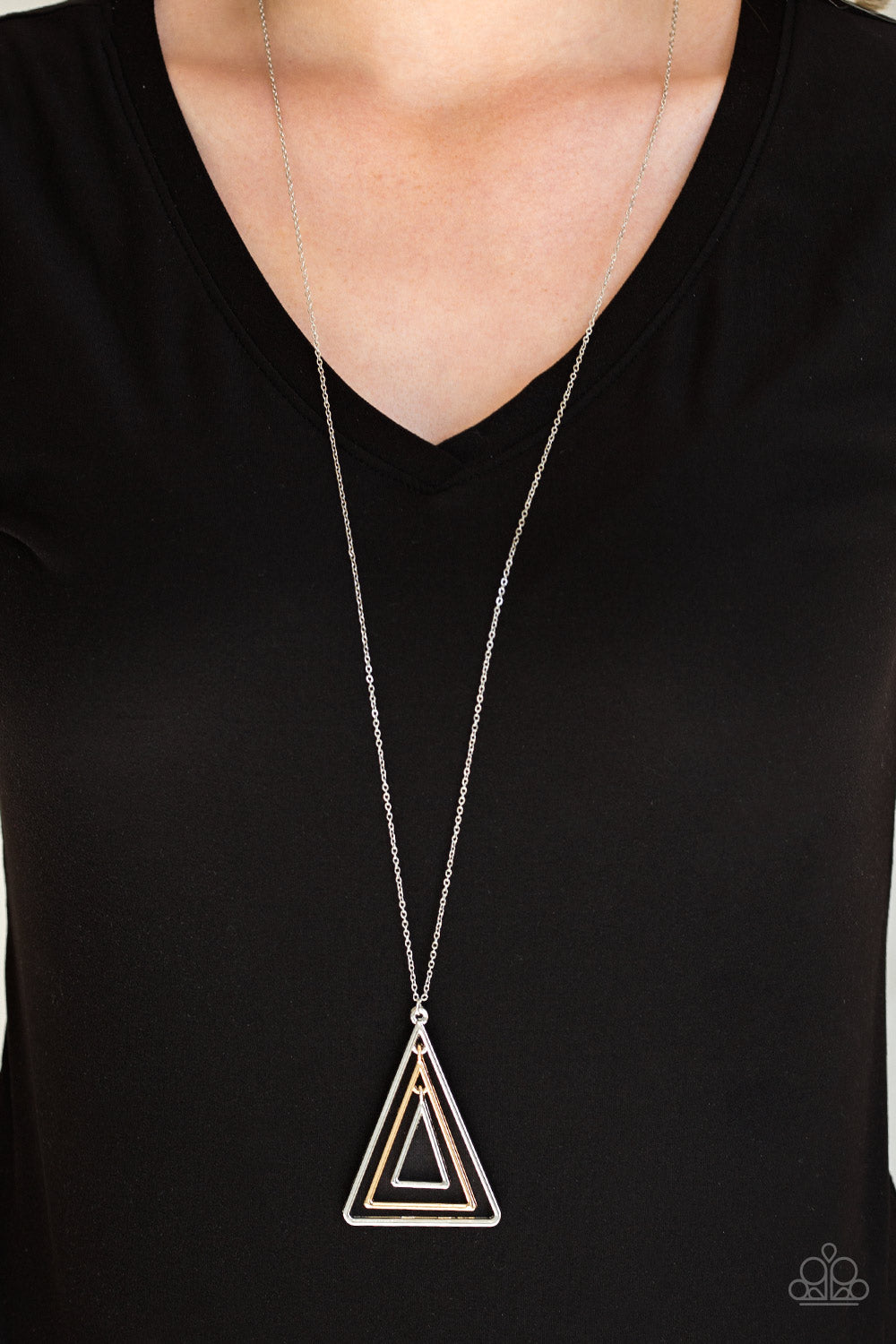 Infused with an elongated brass chain, glistening gold and brass triangular frames layer into a gorgeously stacked pendant for an edgy look. Features an adjustable clasp closure.