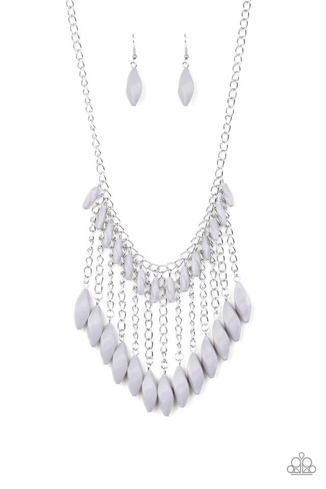 A row of faceted gray beads swing from the bottom of a shimmery silver chain below the collar. Larger gray beads cascade from the bottoms of free-falling silver chains, creating a vivacious fringe. Features an adjustable clasp closure.
