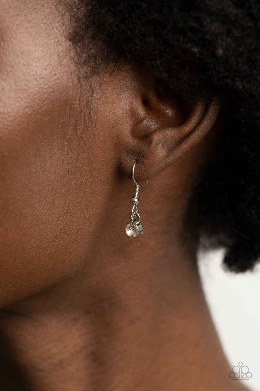 Bordered in glassy white rhinestones, a black gem dotted frame gives way to a curtain of shimmery silver chains, creating a glamorous pendant. Features an adjustable clasp closure.