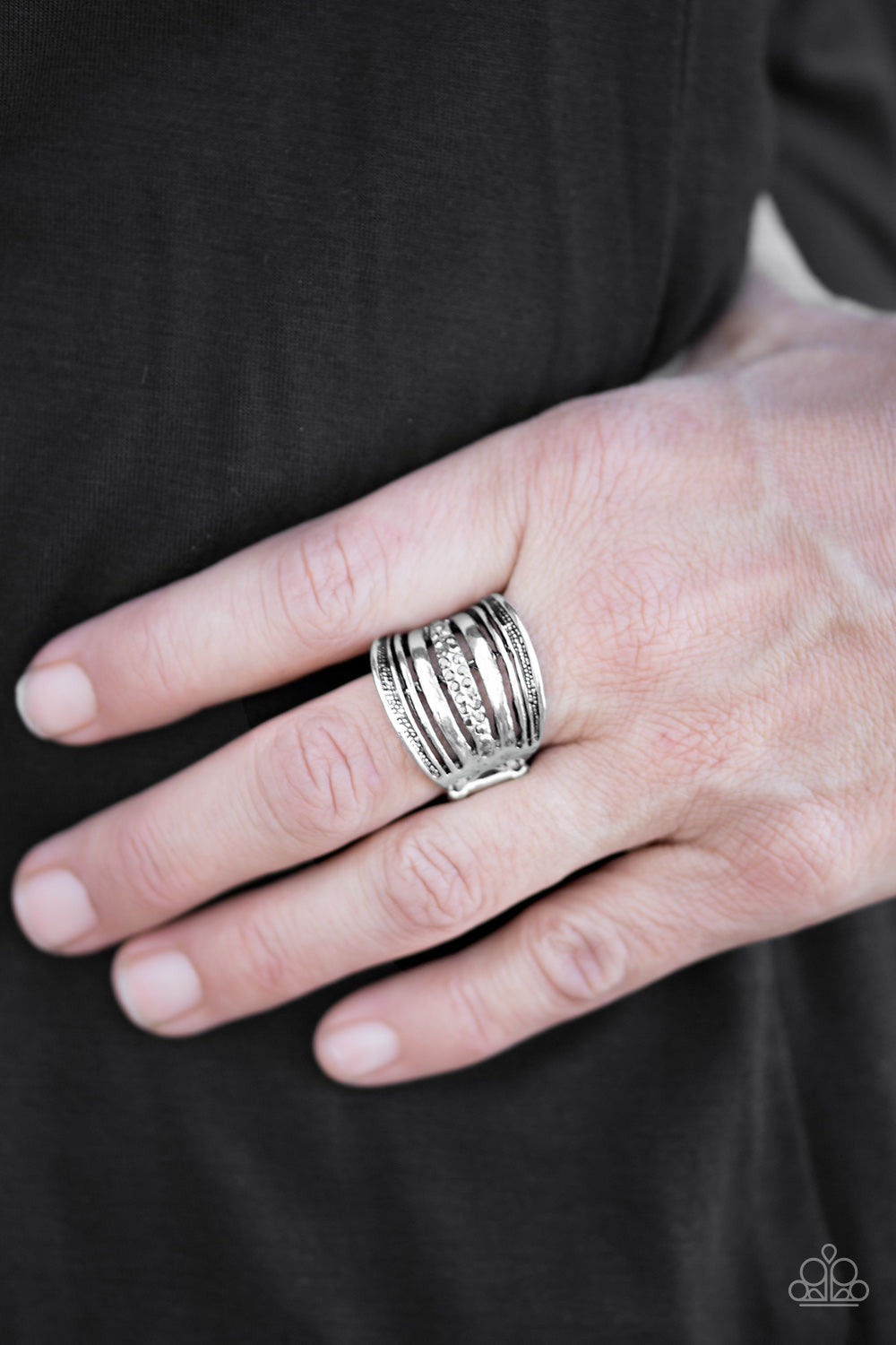 Dotted and smooth silver bars arc across the finger, creating a layered band. Glittery hematite rhinestones are sprinkled along the centermost band, adding bold shimmer to the tribal inspired piece. Features a stretchy band for a flexible fit.