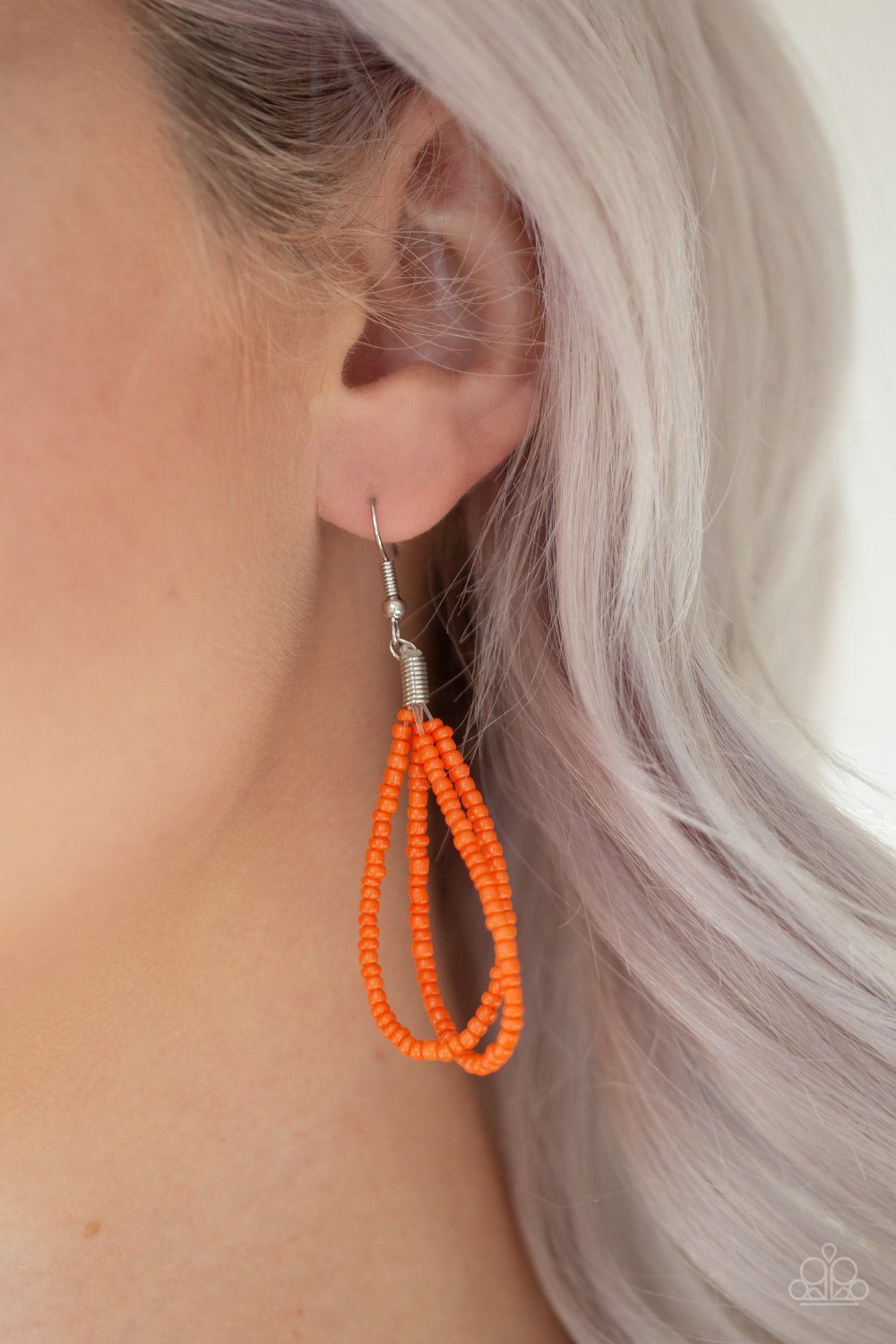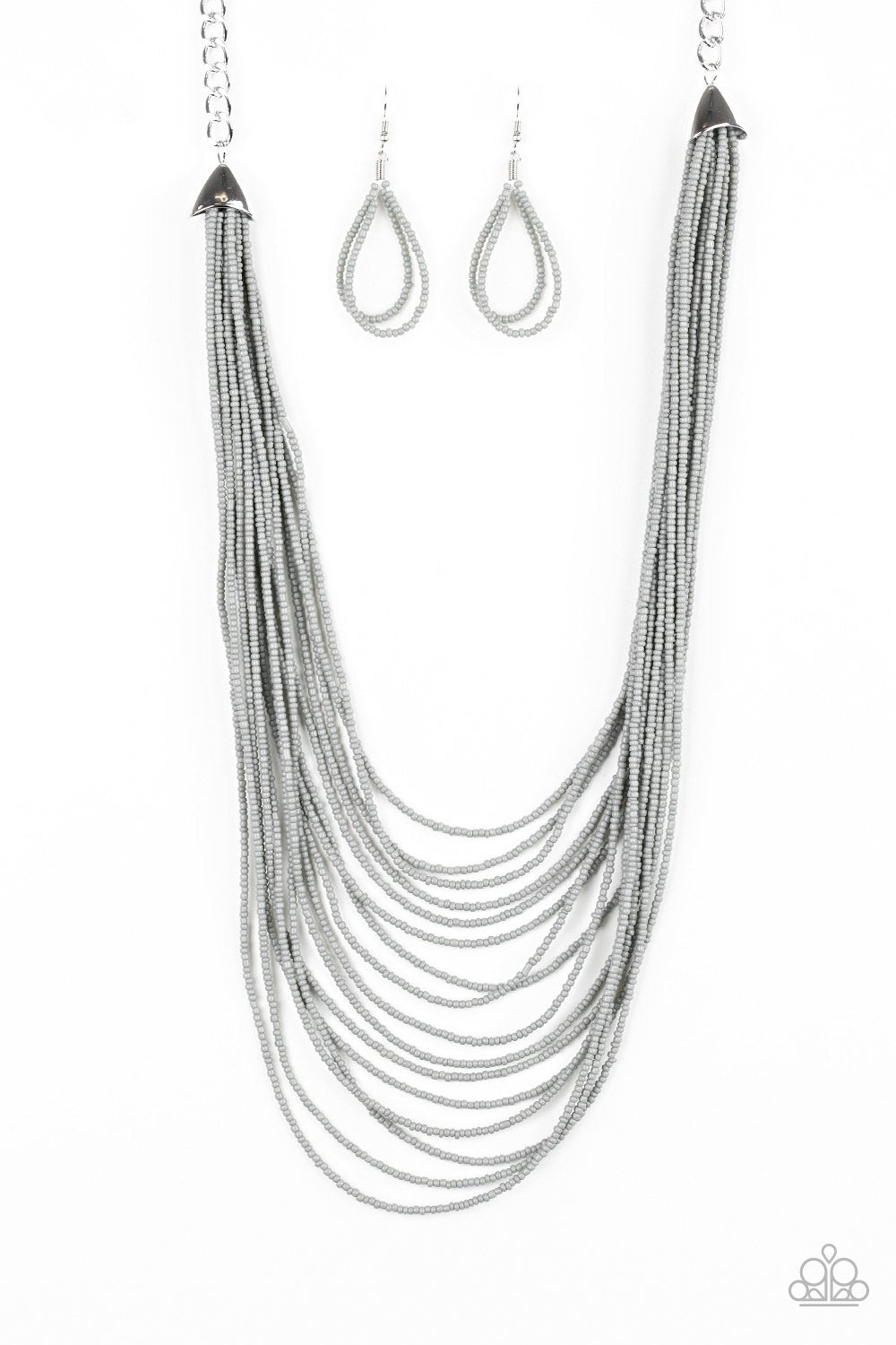 Infused with two bold silver fittings, row after row of orange seed beads layer across the chest for a seasonal fashion. Features an adjustable clasp closure. Also, available in silver.