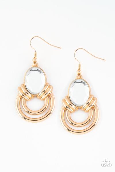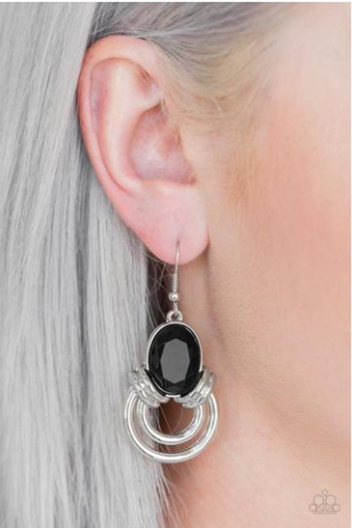 Shimmery silver hoops radiate from the bottom of a dramatic black gem fitting, coalescing into a regal frame. Earring attaches to a standard fishhook fitting.