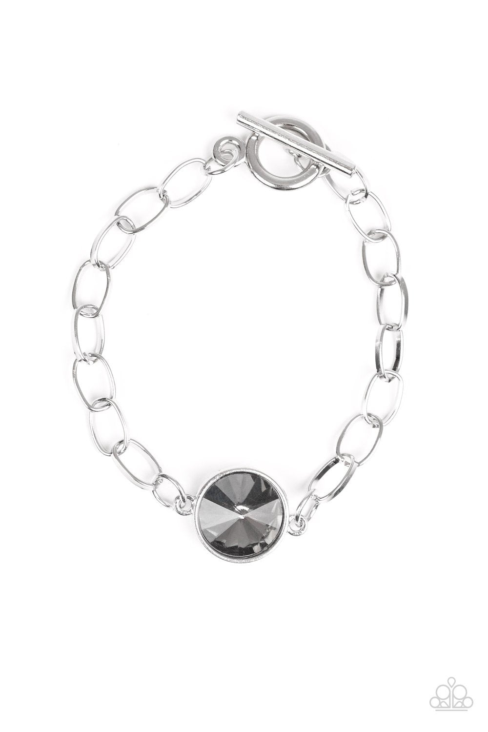 A dramatic smoky gem swings from the bottom of a shiny silver chain, creating a blinding pendant below the collar. Features a toggle closure.  Also, available in white.