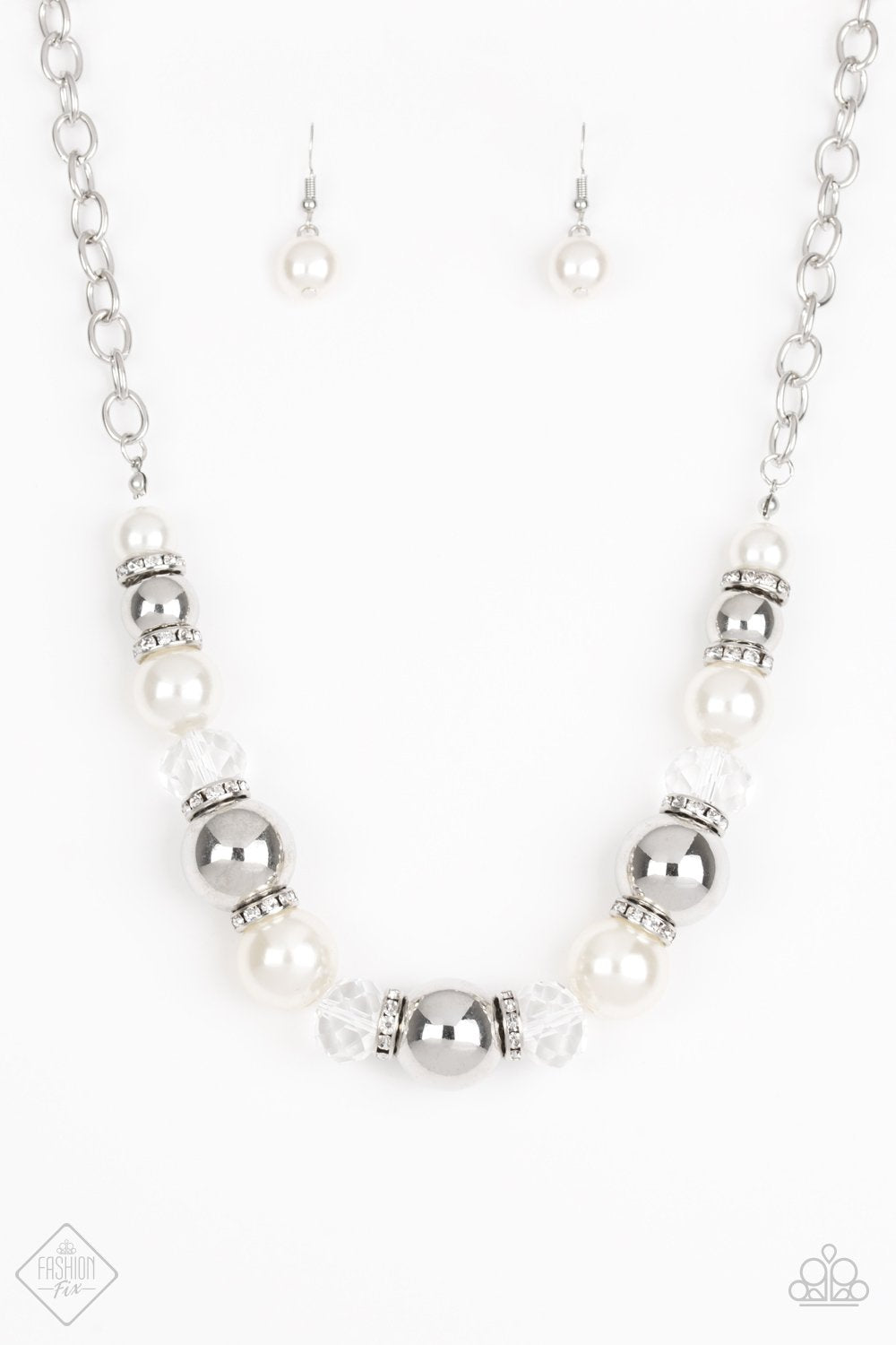 Oversized silver, smoky crystal-like, and polished black beads are threaded along an invisible wire below the collar for a glamorous look. White rhinestone encrusted rings are sprinkled between the dramatic beads for a sparkling finish. Features an adjustable clasp closure. Also, available in white.