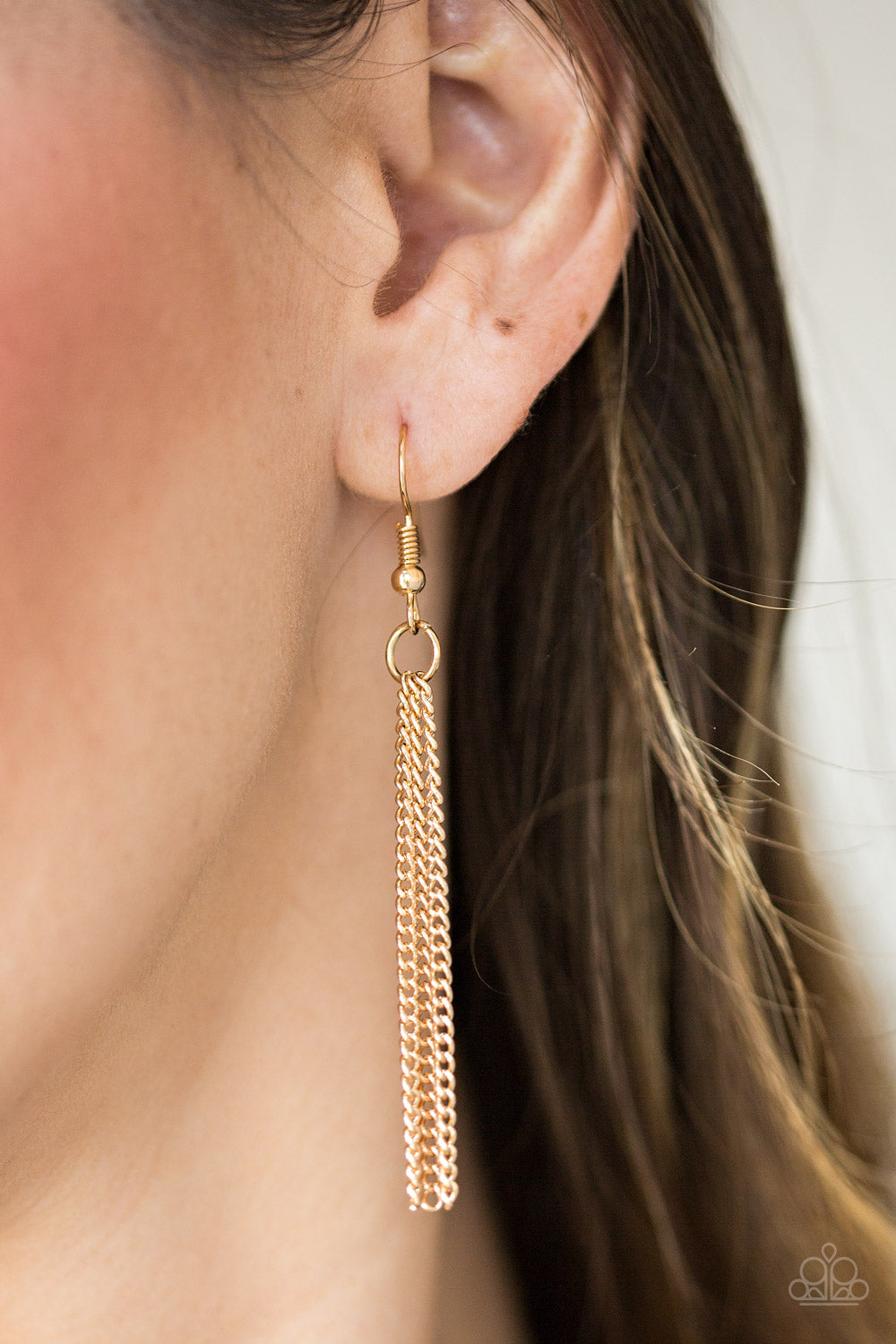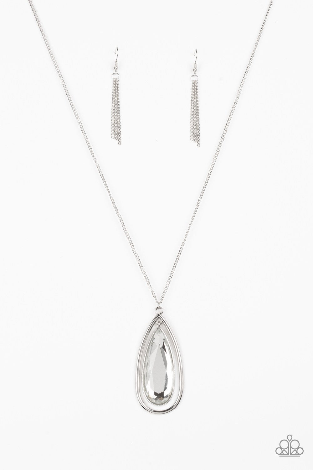 An oversized golden teardrop gem swings from the top of a glistening gold teardrop frame. The dramatic pendant swings from the bottom of an elegantly elongated gold chain for a regal finish. Features an adjustable clasp closure.