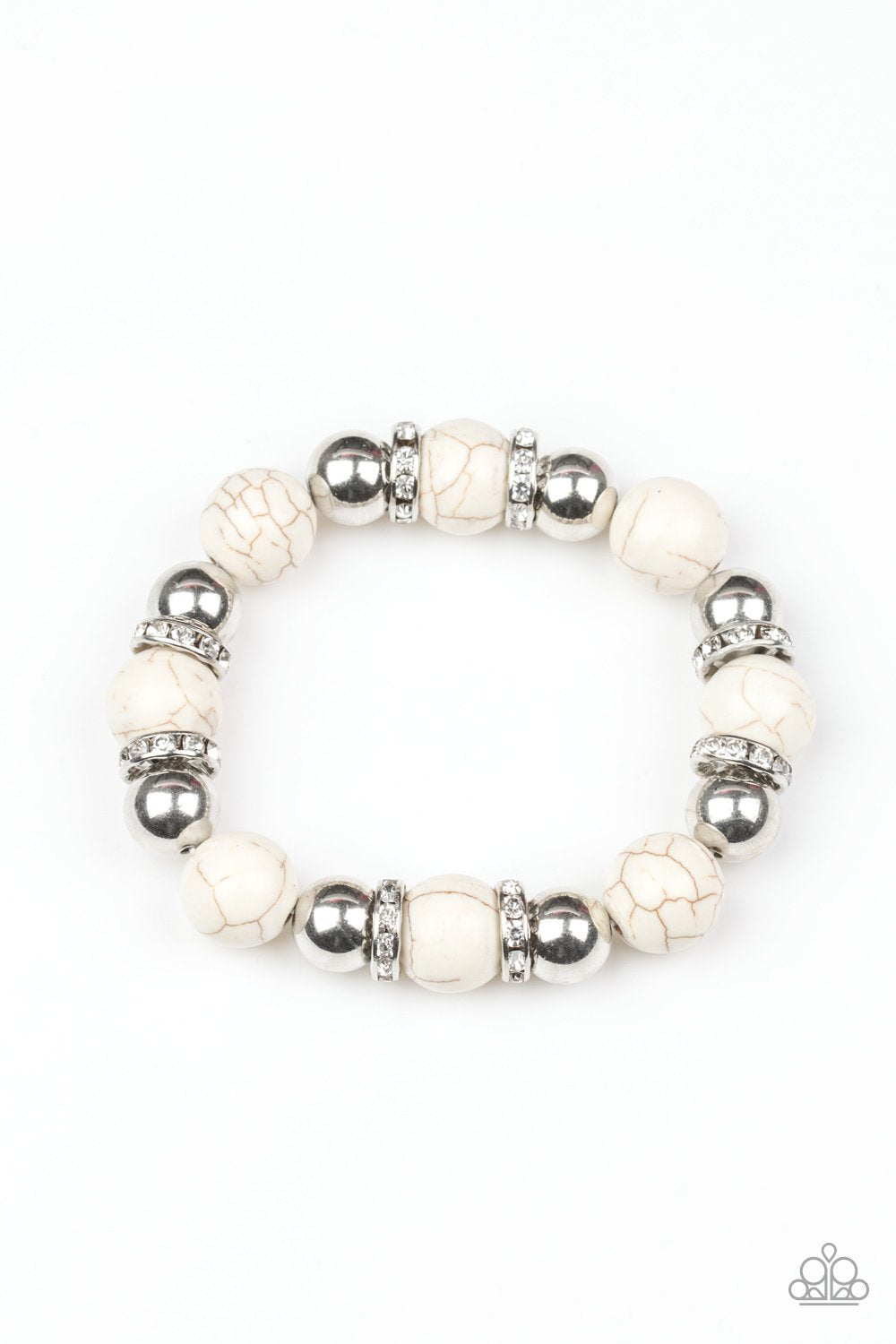 A collection of faux black stones, shiny silver beads, and white rhinestone encrusted rings join below the collar in a refined fashion. Features an adjustable clasp closure. Also, available in white.