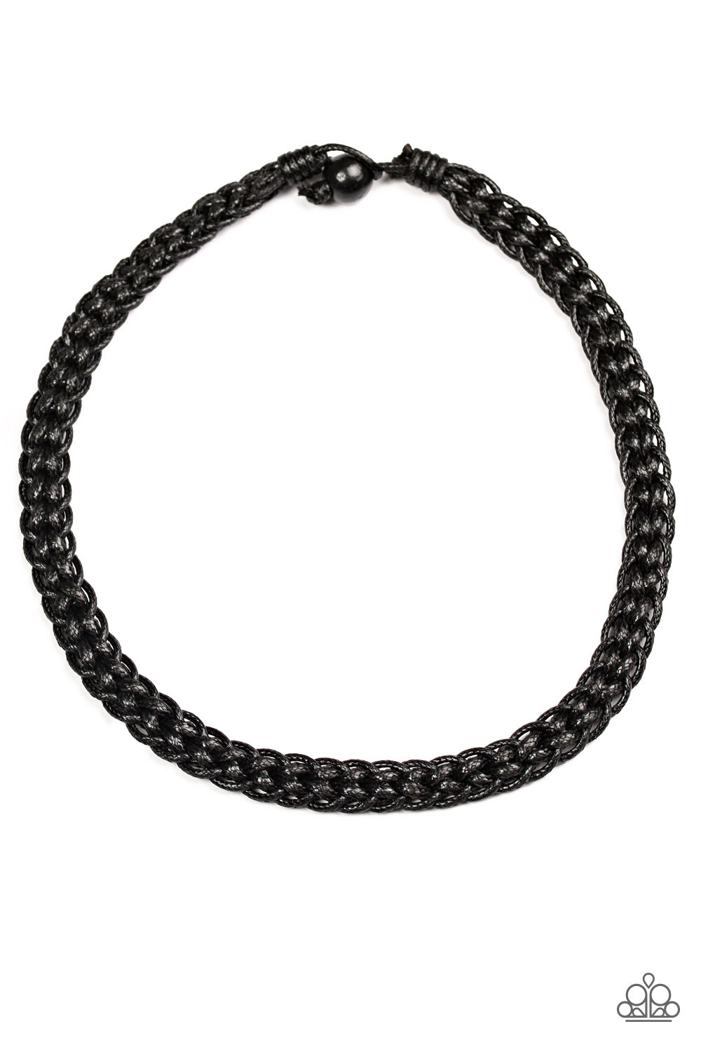Shiny black cording weaves into an urban braid below the collar for a seasonal look. Features a button loop closure