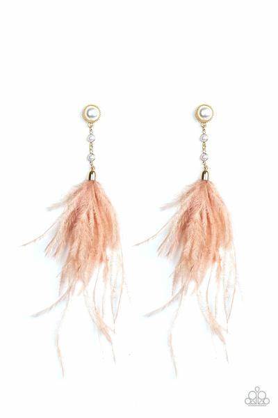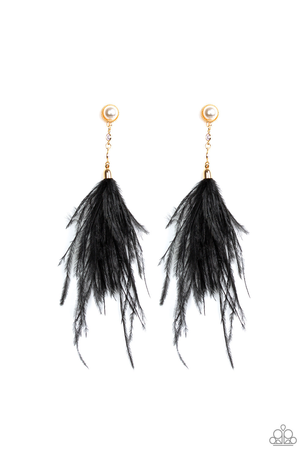 A plume of black feathers flares out from the bottom of linked pearl dotted gold frames, creating a glamorous tassel. Earring attaches to a standard post fitting. Also, available in gold.